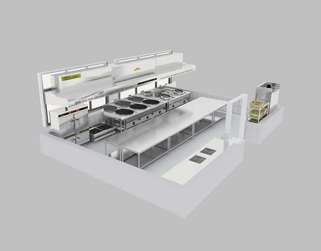 5、备餐区设备有:双星水池、四门碗柜、单通工作台、微波炉、双层工作台、单层烤箱。